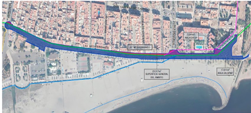 El deslinde propuesto para la solicitud de concesión de ocupación de bienes de marítimo terrestre asciende a un total de 17.811,08 metros cuadrados, y el resto de la actuación, que se encuentra dentro del Límite de Servidumbre de Protección aprobada (SP), asciende a 3.241,30 metros cuadrados. La solicitud de concesión tiene como objetivos la autorización para la reurbanización, ordenación, mejora y actualización del espacio urbano en el frente marítimo. La actuación consiste en la regeneración urbana de la calle consolidada en la actualidad, que sirve de vial distribuidor y de contención del tráfico previo al paseo marítimo. La cesión será durante un periodo de 15 años, más otros 15 de prórroga.