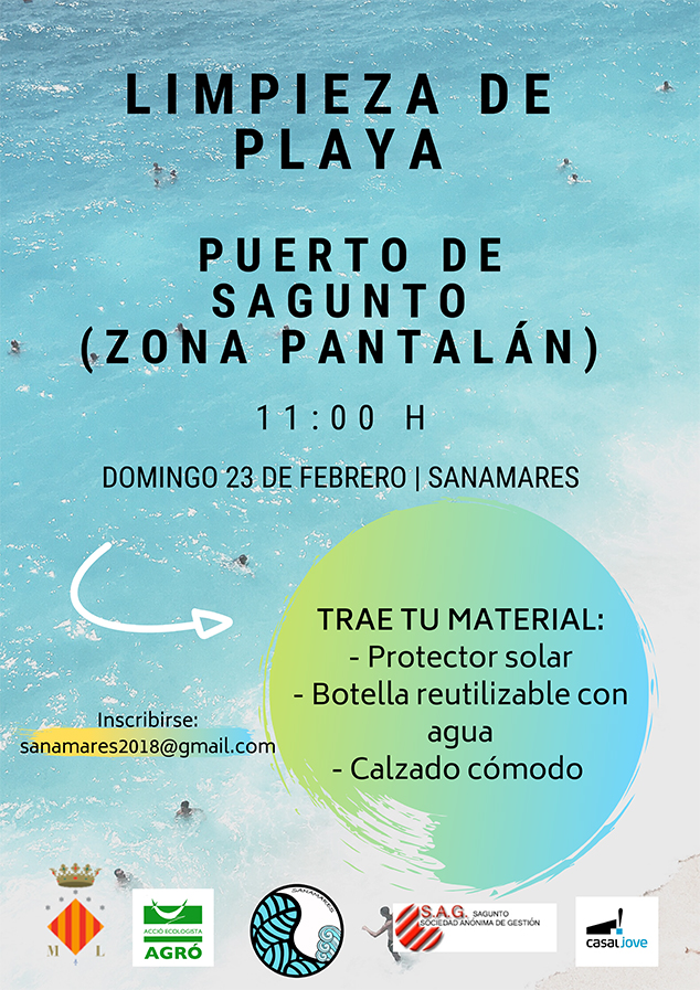 Sagunto celebrará el próximo domingo, 23 de febrero a las 11 horas, una jornada de limpieza en la playa de Puerto de Sagunto. Esta iniciativa, que nace de la mano del proyecto Sanamares con el apoyo del Ayuntamiento de Sagunto, a través de las delegaciones de Playas y Juventud, con la colaboración de Acció Ecologista Agró y la SAG, consistirá en recoger envases y demás restos de basura que se puedan encontrar en la zona sur de la playa junto al Pantalán tras los últimos temporales.