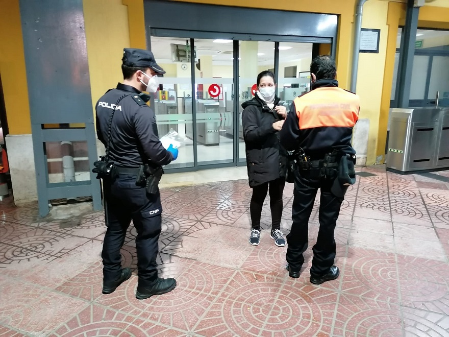 Policía Nacional y Protección Civil entregando mascarillas en la estación de tren de Sagunto