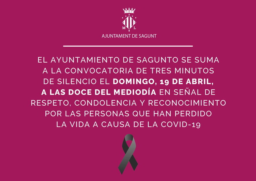 El Ayuntamiento de Sagunto convoca a la ciudadanía a que mañana domingo, 19 de abril, a las 12 horas salga a los balcones y guarde tres minutos de silencio en señal de respeto, condolencia y reconocimiento de las personas que han perdido la vida a causa de la COVID-19.