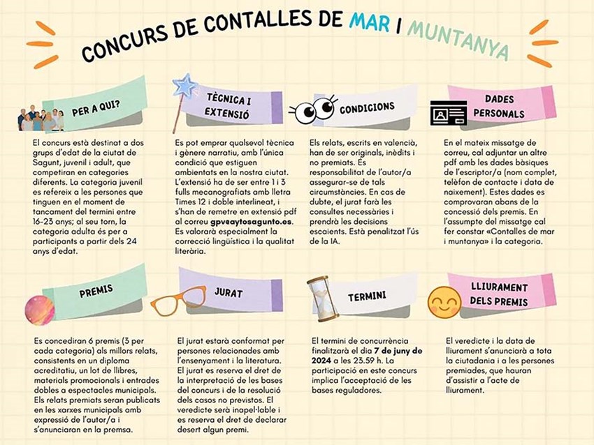 Los departamentos de Promoción del Valenciano y de Participación Ciudadana del Ayuntamiento de Sagunto lanzan una nueva propuesta literaria llamada “Contalles de mar i muntanya”. El objetivo de esta propuesta es dar voz a los relatos que muestran aspectos, anécdotas y espacios de nuestra ciudad. Se trata de un concurso de relatos breves en valenciano abierto a la participación a partir de los 16 años y sin límite de edad entre los adultos.