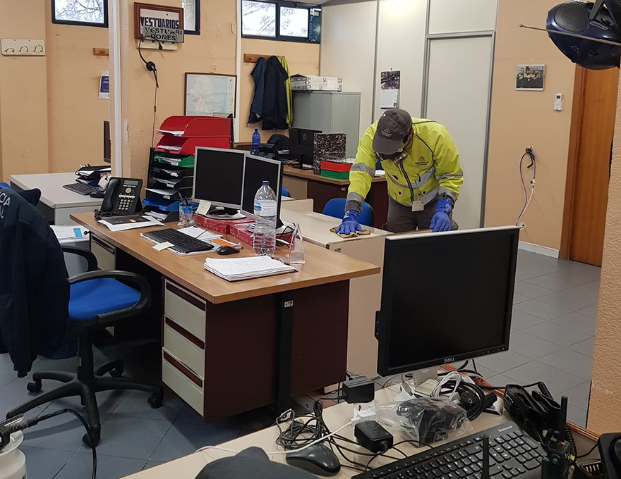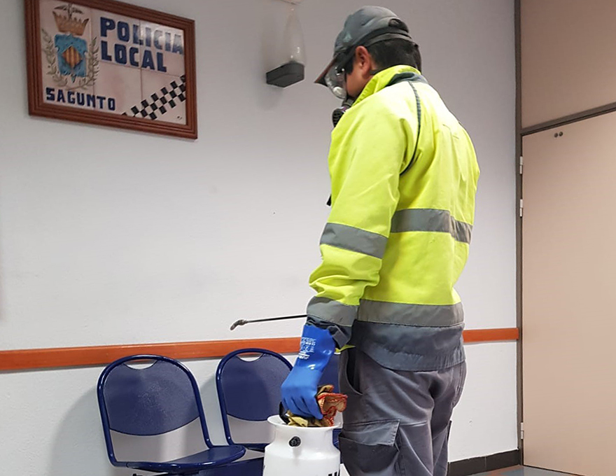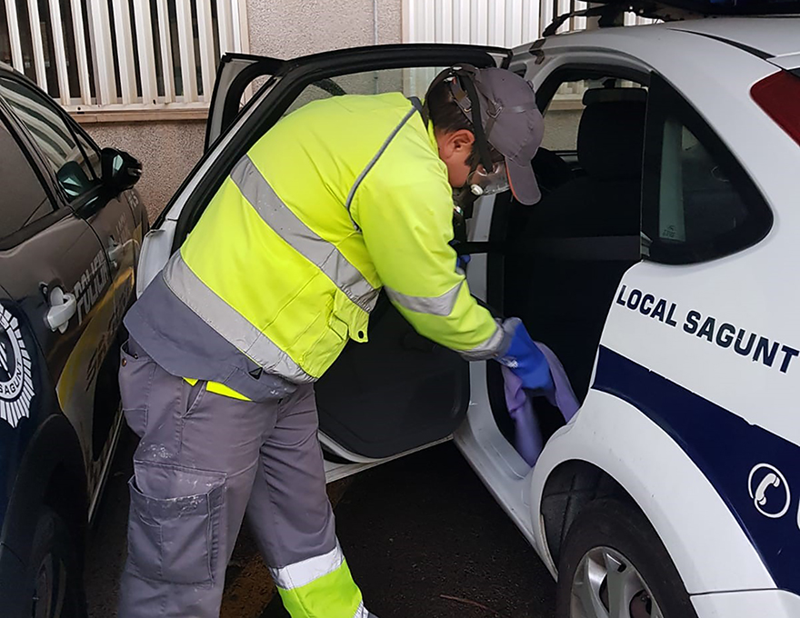 El departamento de Sanidad y Consumo del Ayuntamiento de Sagunto, a través de la empresa encargada del control de plagas, está desinfectando espacios municipales que a día de hoy tienen una gran concurrencia de personal, como por ejemplo la central de la Policía Local o, por sus especiales características en el desempeño de sus funciones, los coches policiales.
