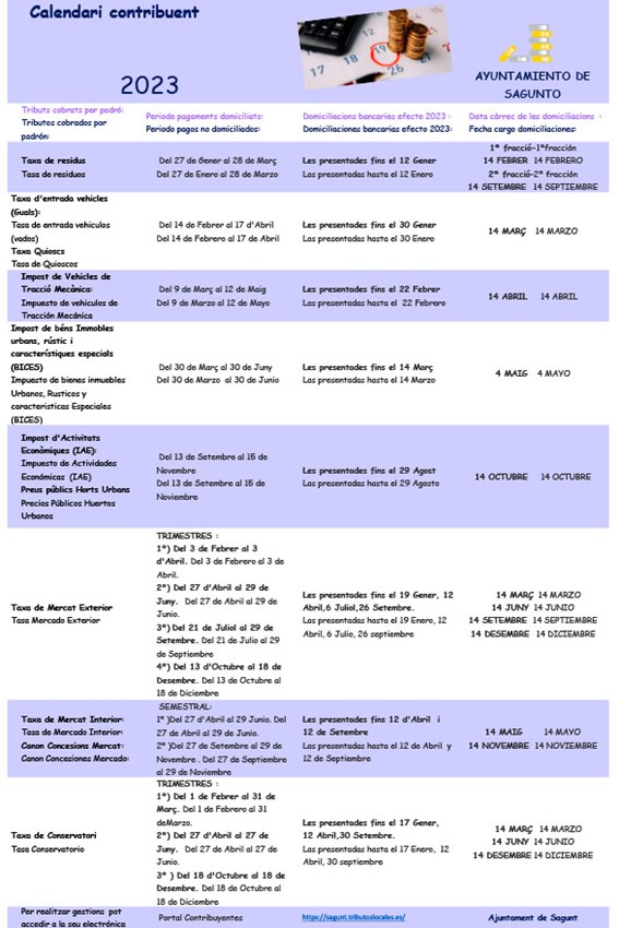 Desde el departamento de Tesorería del Ayuntamiento de Sagunto se ha dado a conocer recientemente el calendario del contribuyente del próximo año 2023 para que toda la ciudadanía pueda conocer las fechas de liquidación de los tributos municipales. El anuncio del calendario se puede consultar en el tablón de anuncios de la Sede Electrónica del Ayuntamiento: https://sagunt.sedipualba.es/tablondeanuncios/anuncio.aspx?id=38453.
