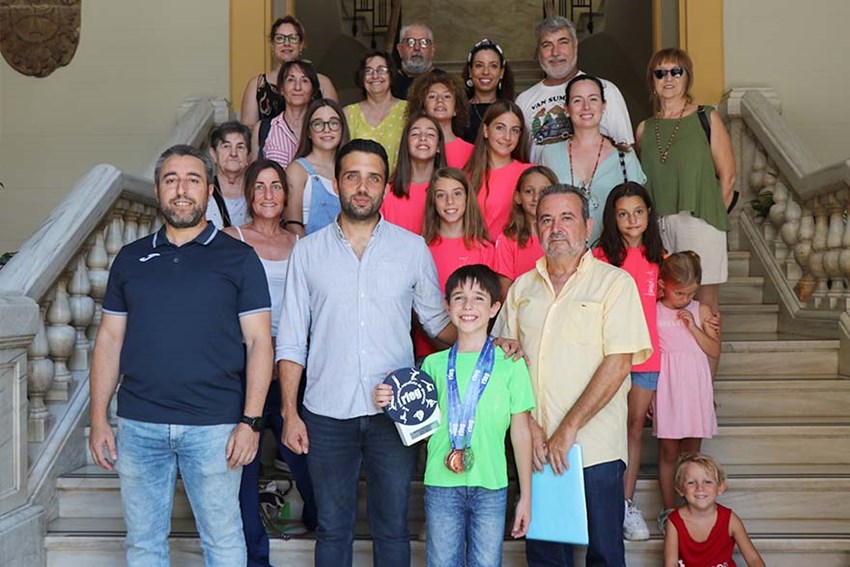 El alcalde de Sagunto, Darío Moreno, y el concejal delegado de Actividad Física, Salud y Deportes, Javier Timón, han recibido esta mañana en el Consistorio a Xavi Requena, gimnasta del Club de Gimnasia Rítmica Morvedre, y a sus compañeras del club por sus recientes éxitos deportivos. Xavi Requena ganó la medalla de plata en el campeonato de España individual y por autonomías disputado en Orense; mientras que sus compañeras que compitieron en la Copa de España de conjuntos en alevín e infantil, formando parte de la selección de la Comunidad Valenciana, celebrada en Zaragoza, consiguieron la tercera posición y, por consiguiente, el bronce en esta competición.