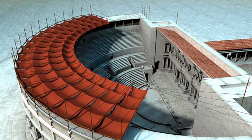 También explica que los romanos en su época para paliar las altas temperaturas utilizaban el velarium, que era una cobertura desplegable de tela compuesta de varias hojas (o velos) de cáñamo, utilizada en los circos, teatros y anfiteatros romanos.