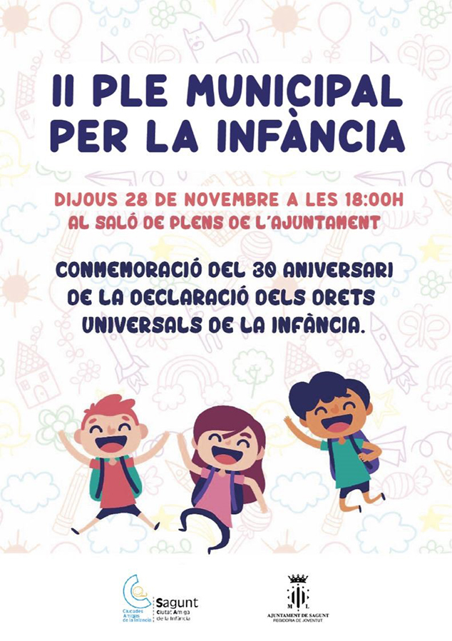 El Ayuntamiento de Sagunto realizará el próximo jueves, 28 de noviembre, el segundo pleno municipal dedicado a la infancia. Tendrá lugar a partir de las 18 horas, cuando se dé lectura a una Declaración Institucional que ha sido redactada por las Comisiones de Infancia y Adolescencia del Consejo Municipal de la Infancia y con la que se conmemora, además, el 30 aniversario de la Declaración de los Derechos Universales de la Infancia.