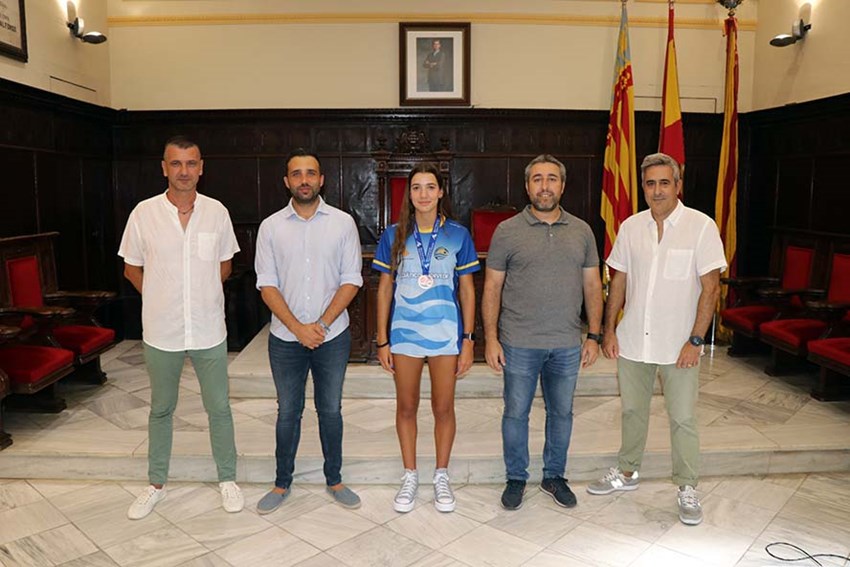 El alcalde de Sagunto, Darío Moreno, y el concejal de Actividad Física, Salud y Deportes, Javier Timón, han recibido hoy, 10 de agosto, a la nadadora María Vicente por sus logros, ya que desde el inicio de su actividad competitiva sus resultados la sitúan entre las mejores nadadoras de su edad en el ámbito autonómico.