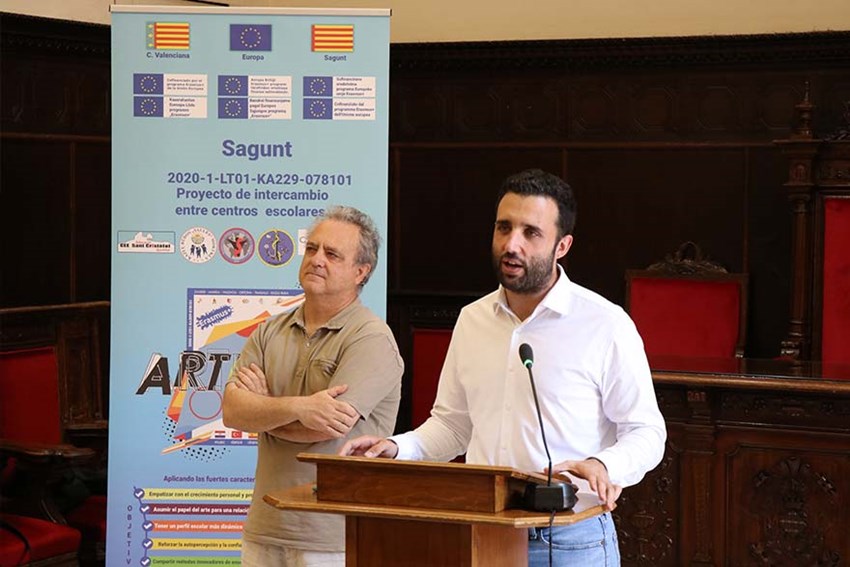 El alcalde de Sagunto, Darío Moreno, y el concejal de Educación, José Manuel Tarazona, han recibido y dado la bienvenida esta mañana a los participantes en el programa Erasmus+ del IES CEE Sant Cristòfol. Este programa está enmarcado en el proyecto ARTHERA del centro, que parte de la idea de que el arte existe en todos los ámbitos de la vida y es imprescindible para la progresión de la sociedad.