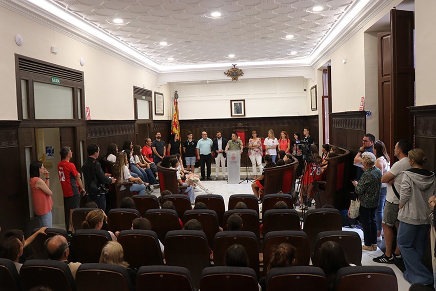 El alcalde de Sagunto, Darío Moreno; el concejal de Actividad Física, Salud y Deportes, Javier Timón; y otros concejales y concejalas del Ayuntamiento recibieron a las deportistas, equipo técnico y directiva del club en el salón de plenos de la casa consistorial.