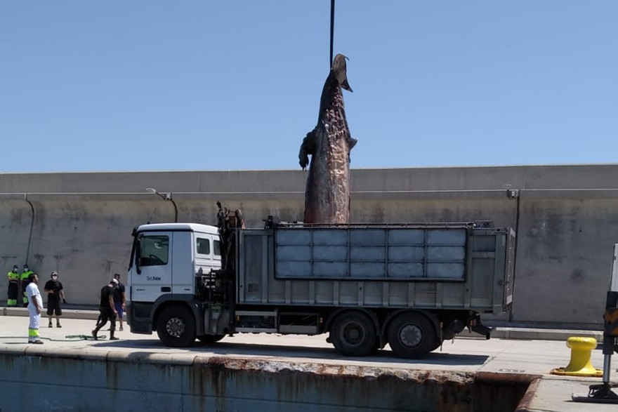 Para la operación de la retirada del ejemplar de zifio de Cuvier se ha contado con la colaboración de la Autoridad Portuaria que ha proporcionado los medios, tanto acuáticos como terrestres, para trasladar el cetáceo desde la costa hasta el muelle este del puerto comercial. Posteriormente, ha sido izado con una grúa desde el agua hasta el camión que ha proporcionado el departamento de Sanidad y que ha trasladado el cuerpo a una planta de tratamiento de animales muertos, según ha explicado del delegado de Sanidad, Javier Timón.