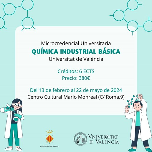 El Ayuntamiento de Sagunto y la Universitat de València ponen en marcha el curso “Microcredencial Universitaria en Química Industrial Básica”, un programa de formación para toda la población y con el que se pretende mejorar la inserción laboral. Las microcredenciales son cursos especializados diseñados para cubrir necesidades de formación para todo tipo de profesionales; en este caso, para profesionales que cuenten previamente con estudios de bachillerato, formación profesional y/o titulados en ciencias básicas y afines.