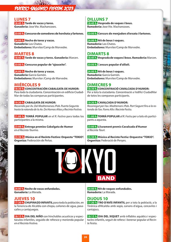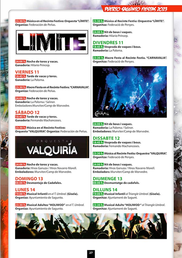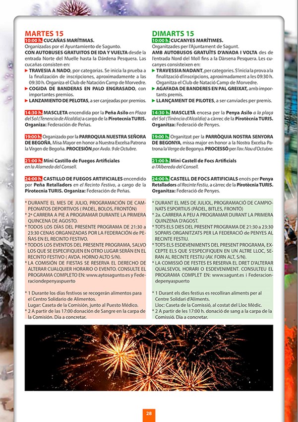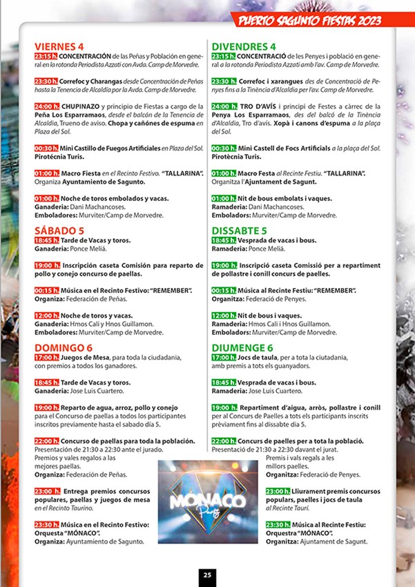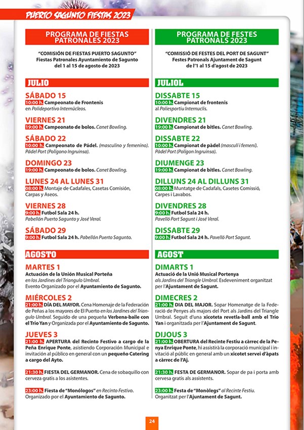 De la infinidad de actos y actividades que tendrán lugar durante las Fiestas Patronales de Puerto de Sagunto, cabe mencionar el Día del Mayor (2 de agosto), el Chupinazo y la Xopà (4 de agosto), la Cabalgata del Humor (9 de agosto), el Día del Niño (10 de agosto), las Cucañas Marítimas (15 de agosto); así como la semana taurina (del 4 al 15 de agosto) con encierros de vacas y toros y la noche de vacas enfundadas (9 de agosto). No obstante, si quiere conocer con mayor detalle toda la programación de este año puede consultar el siguiente enlace: Libro Fiestas 2023 Pto. Sagunto – Federación de Peñas del Puerto Sagunto (federacionpenyaspuerto.es)
