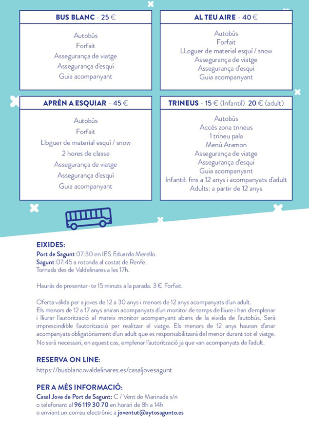 Los menores de 12 a 17 años irán acompañados de un monitor de tiempo de libre y tienen que rellenar y entregar la autorización al mismo monitor antes de la salida del autobús. Será imprescindible la autorización para realizar el viaje. Los menores de 12 años tendrán que ir acompañados obligatoriamente de un adulto que se responsabilizará del menor durando todo lo viaje. No será necesario, en este caso, rellenar la autorización puesto que van acompañados del adulto.