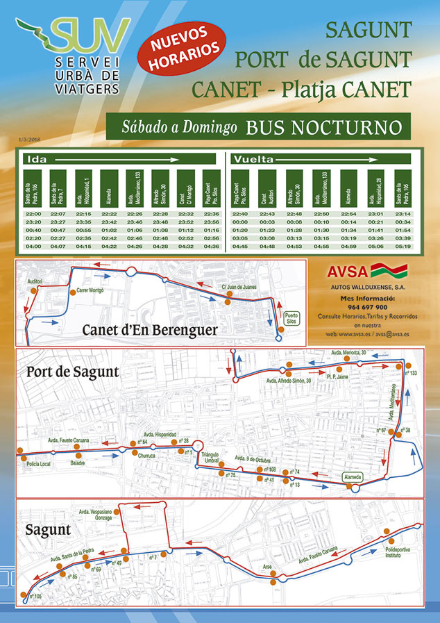 Los interesados pueden consultar los nuevos horarios del “Bus de Nit en las páginas webs de AVSA y el “Servicio Urbano de Viajeros” junto a la información del resto de líneas de autobús urbano: www.avsa.es y www.suvsagunto.es