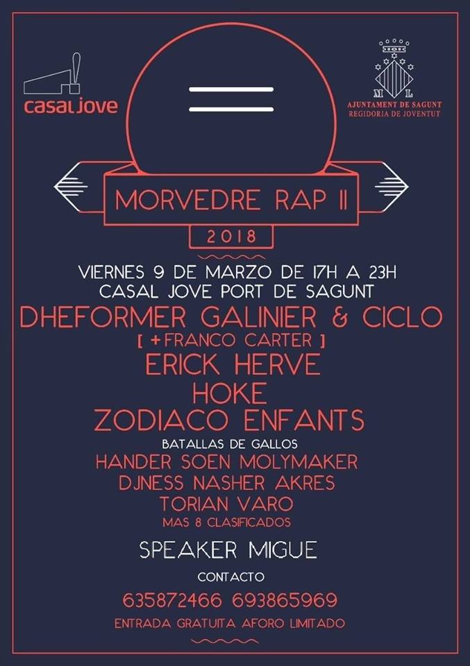 El próximo viernes, 9 de marzo, vuelve el rap al Casal Jove de Puerto de Sagunto. De la mano de la concejalía de Juventud, en colaboración con la asociación Viure Dignament y el colectivo Dragones del Freestyle, tendrá lugar la exhibición final del Morvedre Rap, junto con la última fase del Morvedre Rap Battles.