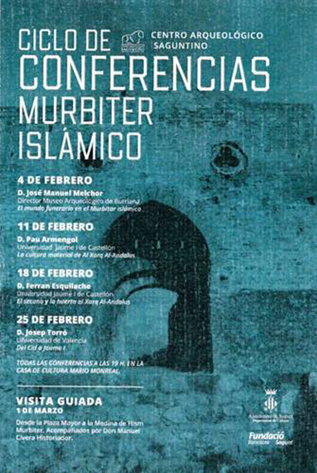 El Centro Arqueológico de Sagunto, con la colaboración de la delegación de Cultura del Ayuntamiento de Sagunto, presenta el ciclo de conferencias Murbiter Islámico durante todo el mes de febrero. Se trata de un ciclo de cuatro conferencias, que se realizarán del 4 al 25 de febrero, y que estarán impartidas por expertos en la época Al-Ándalus. Todas las conferencias se realizarán en el Centro Cultural Mario Monreal a las 19 horas. La entrada es gratuita.