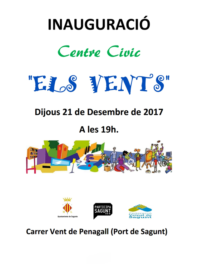 La delegación de Participación Ciudadana del Ayuntamiento de Sagunto junto con la Federación de Vecinos inaugura el Centro Cívico ‘Els Vents’. El acto tendrá lugar el próximo jueves 21 de diciembre, a las 19.00 horas.