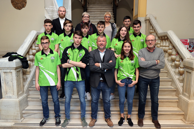 El alcalde de Sagunto, Quico Fernández, y el concejal de Deportes, Miguel Chover, recibieron al equipo de patinadores y patinadoras en el consistorio y les impusieron la insignia de la ciudad