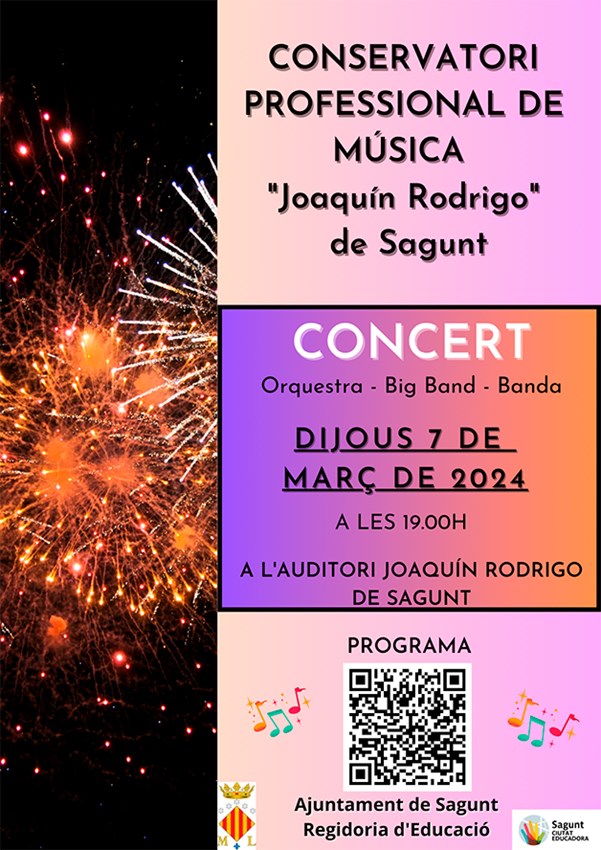 El Conservatorio Profesional de Música Joaquín Rodrigo del Ayuntamiento de Sagunto realizará hoy, lunes 4 de marzo, y mañana, 5 de marzo, las audiciones del segundo trimestre y este jueves, 7 de marzo, ofrecerá un concierto gratuito en L’Auditori Joaquín Rodrigo de Sagunto a las 19 horas, en el que actuarán la Orquesta, la Big Band y la Banda. Estas actuaciones las organiza el Conservatorio municipal dependiente del departamento de Educación.