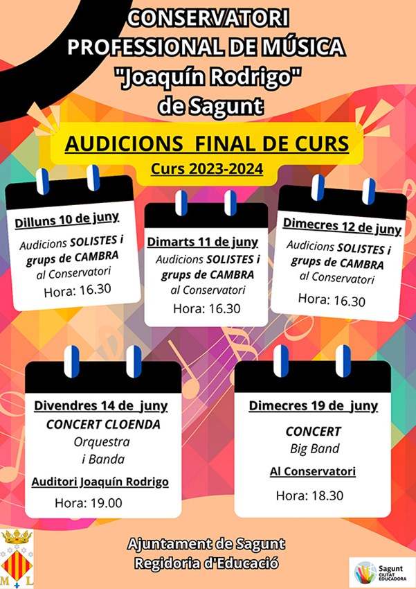 El Conservatorio Profesional de Música Joaquín Rodrigo de Sagunto interpretará su concierto de clausura del curso 2023-2024 este viernes, 14 de junio, a las 19 horas en el auditorio Joaquín Rodrigo de Sagunto.
