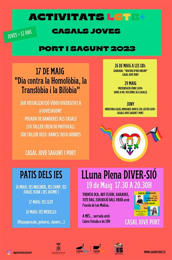 Los Casales Jóvenes de Sagunt i Port del departamento de Juventud e Infancia del Ayuntamiento de Sagunto han organizado actividades LGTB+ con el fin de promover la diversidad y la inclusión, así como apoyar a dicha comunidad, que tendrán lugar en mayo y junio y se dirigirán a los jóvenes de más de 12 años.