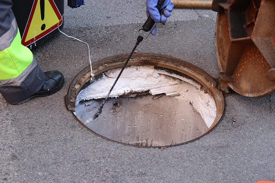 Durante la visita, se ha podido observar el procedimiento de rociar la pintura bajo las tapas del alcantarillado en barrios próximos al mar. Se trata de una tecnología de microencapsulación denominada