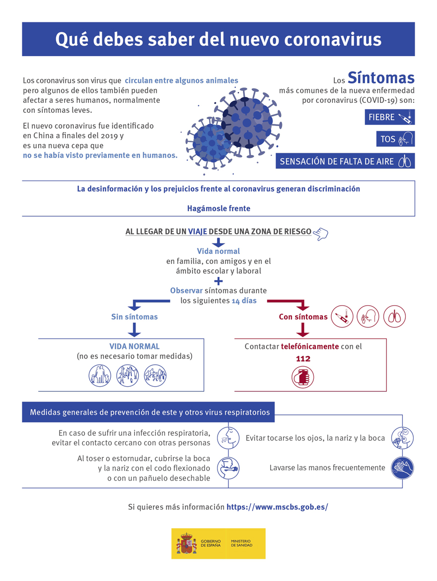 En caso de tener síntomas (tos, fiebre...), se recomienda no acudir directamente a un centro de salud u hospital salvo casos muy graves, ya que en caso de dar positivo, habría un riesgo elevado de contagio con todo aquel que se encuentre en la sala de espera u hospitalizado. En su lugar, se recomienda quedarse en casa, llamar al 900 300 555 e informar de la situación. En este teléfono se informará y tras responder a una serie de preguntas, acudirán al domicilio para tomar muestras.
