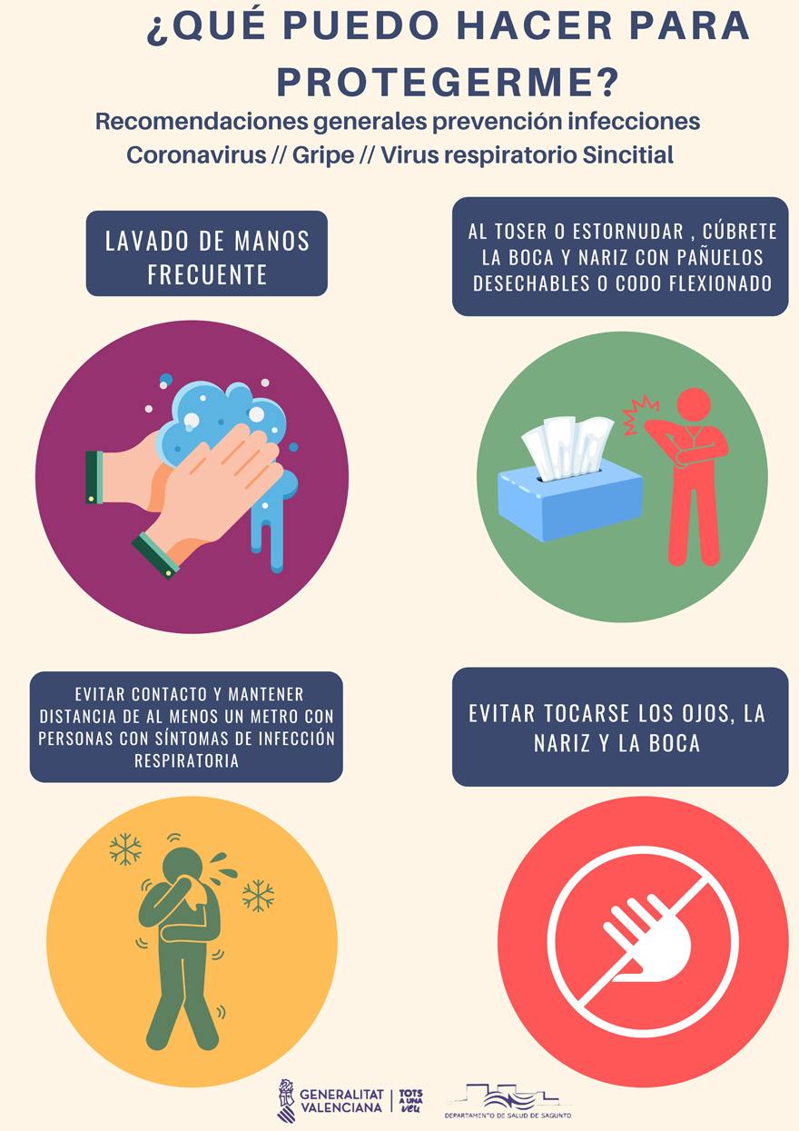 El Departamento de Sanidad del Ayuntamiento de Sagunto ofrece una serie de recomendaciones a la ciudadanía sobre el coronavirus COVID-19. Entre los principales consejos está no acudir directamente al centro de salud u hospital en caso de tener síntomas, ya que hay que llamar al 900 300 555, toser con el codo flexionado evitando la dispersión de saliva y no comprar masivamente mascarillas.