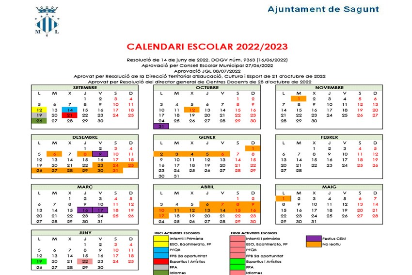 La Dirección Territorial de Educación, Cultura y Deporte de Valencia dictó la resolución por la cual se autorizaron como días festivos el pasado día 31 de octubre y los próximos días 9 de diciembre de 2022 y 17 de marzo de 2023,  a efectos escolares del calendario escolar para el curso académico 2022-2023, tal y como solicitó el Ayuntamiento de Sagunto por acuerdo del Consejo Escolar Municipal, en sesión ordinaria celebrada el 27 de junio de 2022.