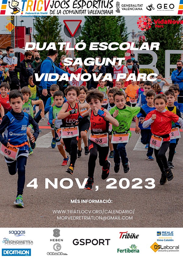 El Club Morvedre Triatlón, en colaboración con el Ayuntamiento de Sagunto y VidaNova Parc, organiza la IV edición del Duatlón Escolar. La prueba se celebrará el próximo sábado 4 de noviembre de 2023 a partir de las 9 horas en el aparcamiento del centro comercial VidaNova Parc y sus alrededores y durará toda la mañana. Contará, además, con la participación de unos 400 escolares. La prueba forma parte del calendario de los juegos deportivos de la Comunidad Valenciana.