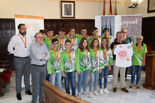 El Ayuntamiento de Sagunto recibió ayer por la tarde al equipo alevín del Club de Patinaje Alas de Sagunto. El motivo de este reconocimiento fue que el equipo logró la 2ª posición en el Campeonato de España de Hockey Línea Sagunto 2018, que se celebró en nuestra localidad el fin de semana del 15 al 17 de junio. A la recepción asistieron el alcalde de Sagunto, Quico Fernández; el concejal de Deportes, Miguel Chover; así como el equipo alevín del club, los padres de los jugadores y algunos representantes del club.