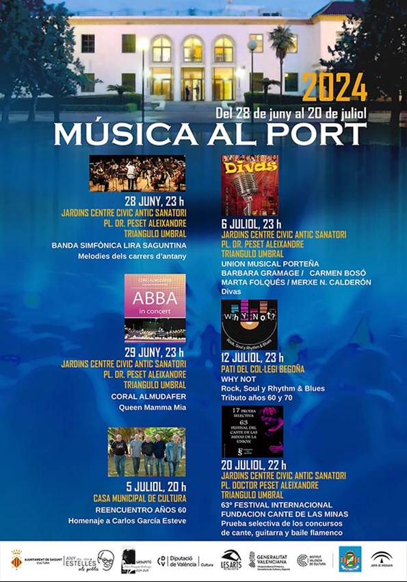El festival Música al Port regresa al municipio con un cartel en el que se anuncian seis actuaciones de diversos géneros musicales programadas entre el 28 de junio y el 20 de julio. Como ya viene siendo tradición, este festival veraniego tendrá lugar como escenario principal en los jardines del Centro Cívico Antiguo Sanatorio, esta localización del Triángulo Umbral de Puerto de Sagunto también ha sido el lugar elegido para la presentación de la presente edición. En el acto ha participado el alcalde de Sagunto, Darío Moreno, y la concejala de Cultura, Ana María Quesada, así como representantes de las agrupaciones participantes.