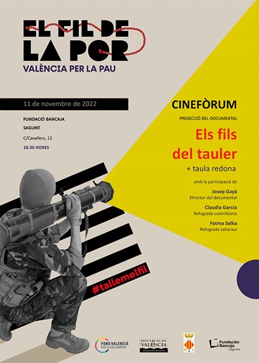 El cinefórum se dividirá en dos sesiones: una que girará alrededor de la exposición El fil de la por, y en que se trabajarán las causas de los flujos migratorios y de personas refugiadas, el comercio de armas, el gasto militar, la militarización de fronteras, el negocio de la guerra, los conflictos armados y la securización; y, otra, en la cual se visualizará el documental Els fils del tauler, seguido de la mesa redonda, que contará con la participación del director del metraje, Josep Gayà, y las refugiadas Claudia García y Fatma Salka, de Colombia y el Sáhara respectivamente.