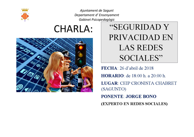 El Gabinete Psicopedagógico Municipal ha organizado una charla sobre redes sociales en el CEIP Cronista Chabret. Por segundo año consecutivo se está llevando a cabo un programa de prevención del acoso escolar dirigido al alumnado de 5º y 6º de Primaria. El próximo jueves 26 de abril, de 18.00 a 20.00 horas, este centro acogerá la charla ‘Seguridad y privacidad en las redes sociales’, a cargo del experto, Jorge Bono.