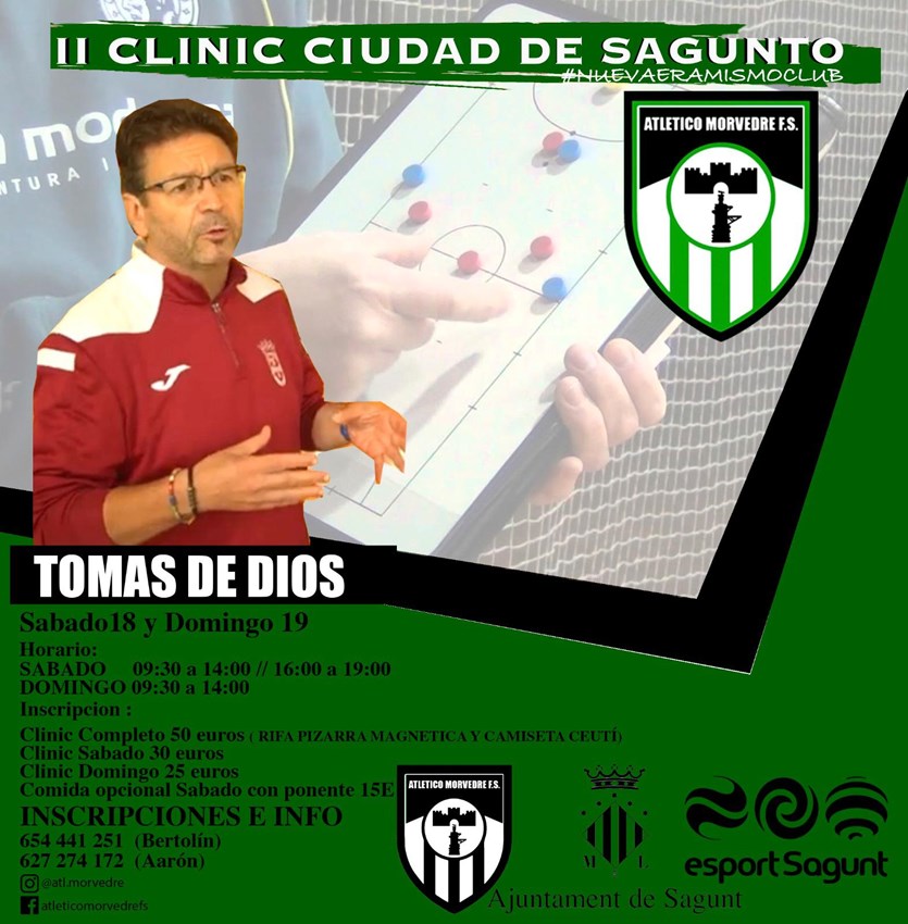 El pabellón polideportivo José Veral de Puerto de Sagunto será el escenario donde se desarrollará el II Clínic Ciudad de Sagunto de fútbol sala que organiza el Atlético Morvedre FS con la colaboración del Ayuntamiento de Sagunto, a través del Departamento de Actividad Física, Salud y Deportes. El plazo de inscripción termina el viernes a última hora.