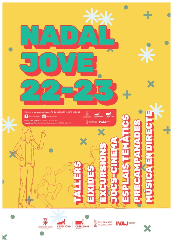 Como cada año, el departamento de Juventud e Infancia del el Ayuntamiento de Sagunto organiza una serie de actividades para estas fechas. Este año, la programación del Nadal Jove está llena de actividades de todo tipo como talleres, salidas, tardes, esplai jove, proyecciones de documentales y la Nit Jove. Todas las actividades están dirigidas a público joven y adolescente, y tendrán lugar tanto al Casal Jove de Puerto de Sagunto como al Casal Jove de Sagunto.