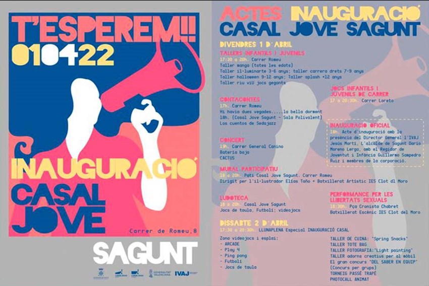 La inauguración del Casal Jove de Sagunto, emplazado en el edificio adquirido y remodelado por el Ayuntamiento de Sagunto de la antigua sede de la ONCE, ubicado concretamente en la calle José Romeu, tendrá lugar el próximo viernes, 1 de abril, a las 18 horas . Asimismo, a partir de las 17 horas hay programadas una gran oferta de actividades y servicios destinados a la población más joven del núcleo histórico de la ciudad.