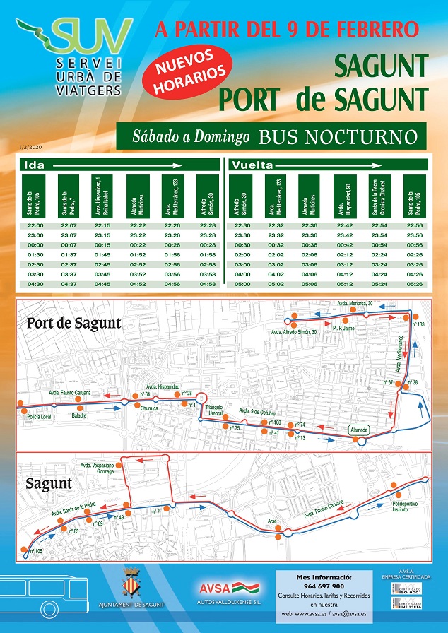 Los nuevos horarios y paradas del servicio del Bus de Nit que presta el Ayuntamiento de Sagunto estarán disponibles a partir del próximo domingo, 9 de febrero. Este servicio se desplaza desde Sagunto a Puerto de Sagunto cada madrugada de sábado y domingo. La finalidad de estas nuevas medidas es adaptarlo a las demandas de los usuarios, principalmente los jóvenes de la ciudad, que solicitaban novedades y una ampliación del servicio que lo hiciera más efectivo. Los desplazamientos se realizarán por ambos núcleos, desde el casco histórico hasta las zonas de ocio de la localidad.