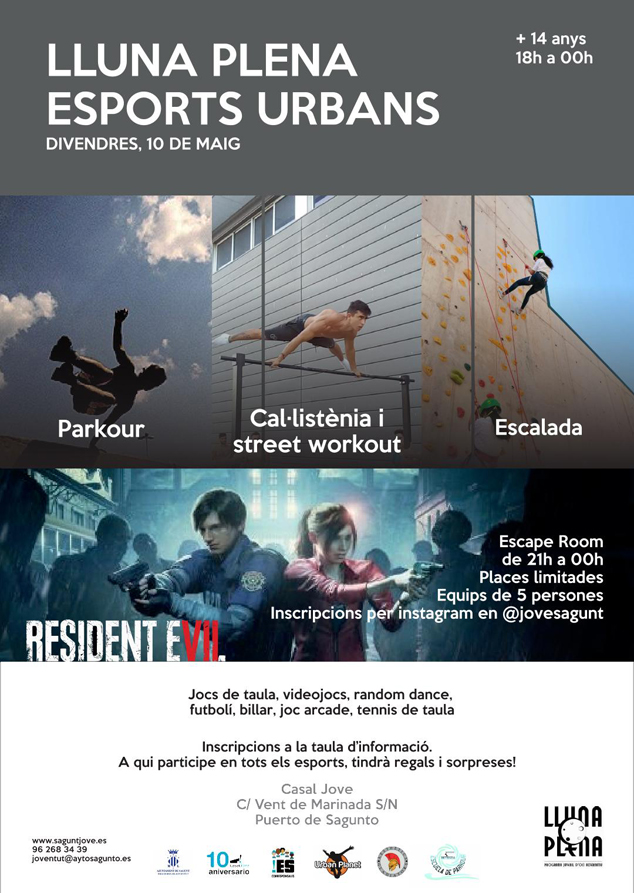 El programa de ocio alternativo Lluna Plena regresa este viernes con especial dedicación a los deportes urbanos. La concejalía de Juventud del Ayuntamiento de Sagunto proporciona una serie de talleres y actividades para jóvenes de más de 14 años que tendrán lugar este sábado 10 de mayo, de 18 a 24 horas en el Casal Jove de Puerto de Sagunto.