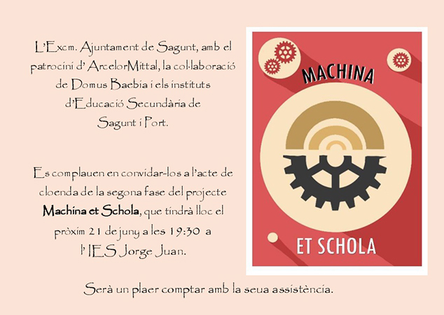 El Ayuntamiento de Sagunto ha organizado el acto de clausura de la segunda fase del proyecto educativo Machina et Schola. Este evento tendrá lugar mañana, jueves 21 de junio, a las 19.30 horas, en el salón de actos del IES Jorge Juan.