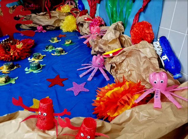 Los estudiantes del primer colegio en recibirlo, el CEIP Cronista Chabret, han decorado un espacio en su centro dedicado al mundo marino, en el que todos los elementos simulan animales y plantas acuáticas, realizados todos ellos con material reciclado. Los escolares han transformado garrafas de agua en caparazones de tortugas marinas, botellas en medusas y platos desechables en caballitos de mar.