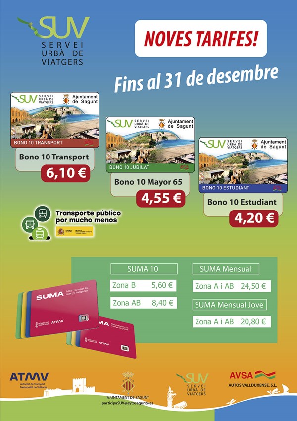 El Ayuntamiento de Sagunto quiere recordar a los usuarios que los títulos SUMA de la Autoridad del Transporte Metropolitano de Valencia, que también se beneficia desde este jueves de la bajada de precios aprobada en este caso por la Generalitat Valenciana, también son válidos en el transporte urbano.