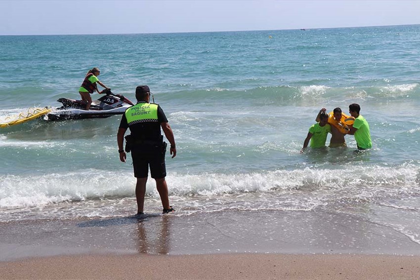 El servicio de socorrismo y salvamento marítimo del Ayuntamiento de Sagunto, coordinado con la Policía Local de Sagunto, ha realizado esta mañana un simulacro de rescate en la playa de Almardà con el fin de comprobar la eficacia de los protocolos de actuación. El simulacro se ha efectuado frente a la torre situada a la altura del hotel Els Arenals.