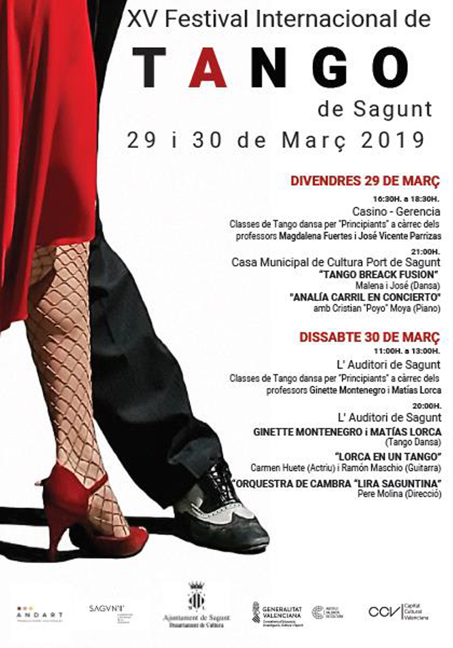 Por otro lado, el sábado, de 11 a 13 horas, habrá más clases de tango para principiantes en el Auditorio Joaquín Rodrigo de Sagunto, esta vez a cargo de los profesores Ginette Montenegro y Matías Lorca, que ofrecerán, a las 20 horas, una actuación de tango también en el auditorio. Ginette Montenegro es una bailarina argentina que ha realizado exhibiciones por distintos lugares del mundo, así como en la Cumbre Mundial del Tango del año pasado en Melilla. Del mismo modo, el bailarín Matías Lorca está formado en distintas disciplinas artísticas y es el director de la escuela de tango La Cultural de Valencia.