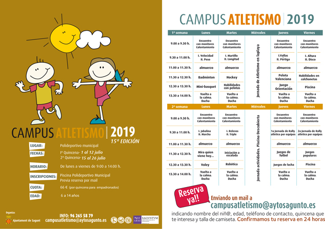 La reserva se realizará a través del correo electrónico campusatletismo@aytosagunto.es aportando los siguientes datos: nombre del niño/as, edad, teléfono de contacto, quincena en la que está interesado/a y talla de la camiseta.