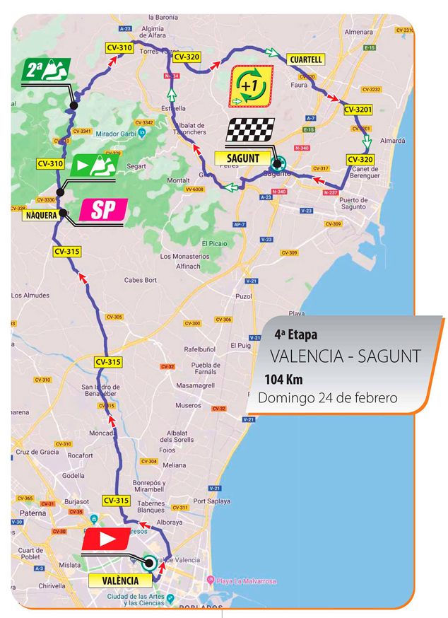 El recorrido de la cuarta etapa será el siguiente: Valencia, Poble Nou, Moncada, San Isidro de Benagéber, Náquera, Serra, Alto del Oronet, Torres Torres, Cuartell, Puerto de Sagunto y Sagunto, donde tendrá lugar la meta.