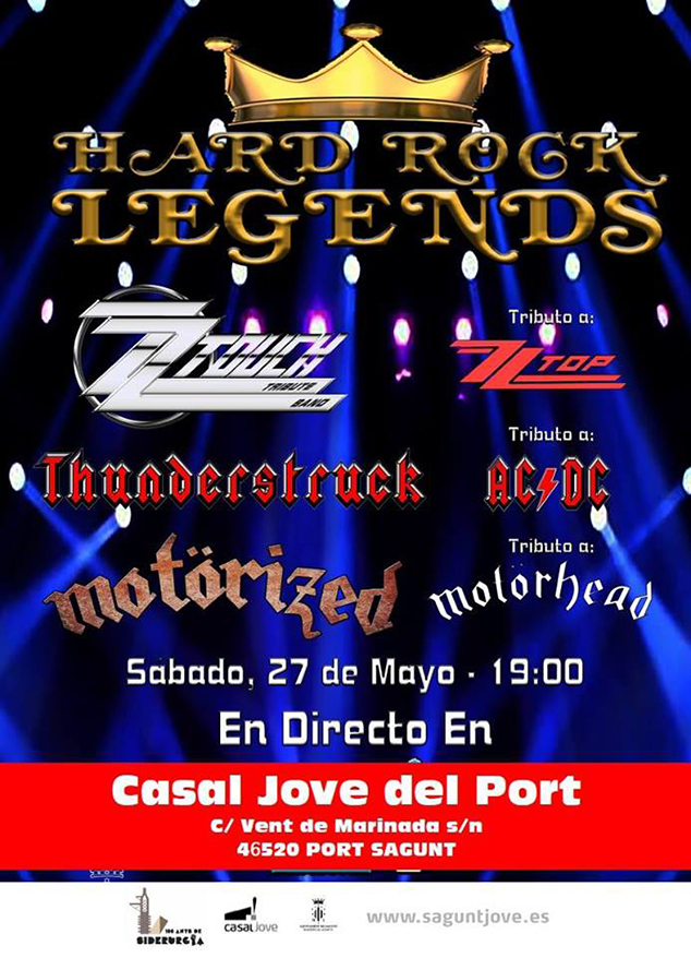El Casal Jove acogerá el próximo sábado 27 de mayo a las 19 horas el concierto Hard Rock Legends, en el que tres bandas rendirán tributo a ZZ Top, AC/DC y Motorhead. Las bandas que participarán son ZZ Touch, Thunderstruck y Motörized. El concierto está organizado por la concejalía de Juventud del Ayuntamiento de Sagunto.