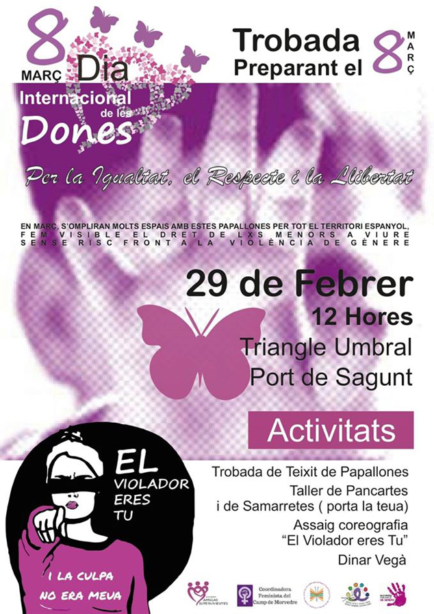 Las actividades que incluye la programación son la de una quedada de tejido de mariposas, que forma parte de una iniciativa con la que se llenarán muchos espacios con estas mariposas por todo el territorio español en el mes de marzo. También, en este encuentro tendrá lugar un taller de pancartas y camisetas (trae la tuya) y el ensayo de la coreografía El violador eres tú, y por último, una comida vegana.
