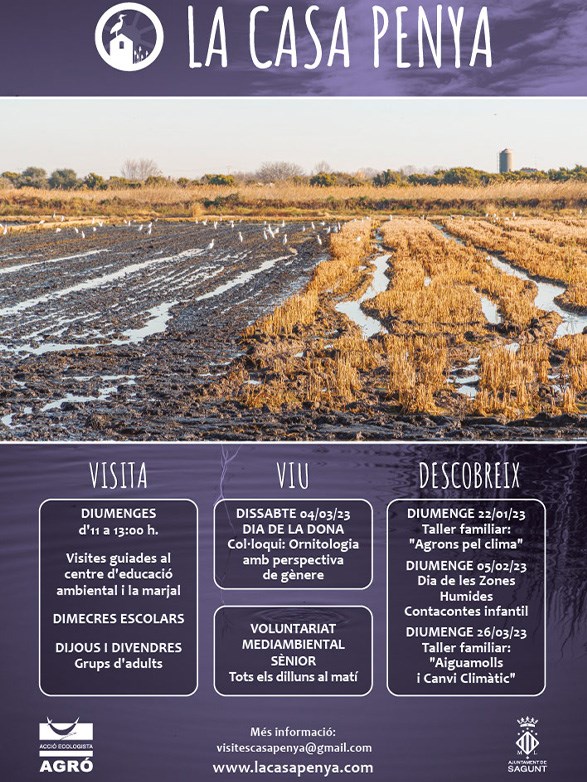 La Casa Penya arranca 2023 con el calendario lleno de actividades dirigidas a todos los públicos. Además del voluntariado sénior de los lunes, de los miércoles escolares y de las visitas guiadas de los domingos, de enero a marzo Acción Ecologista-Agró y el Ayuntamiento de Sagunto (Camp de Morvedre, València) organizan dos talleres sobre Cambio Climático para toda la familia, un coloquio con expertas en ornitología para celebrar el Día de la Mujer y un cuentacuentos infantil con motivo del Día de las Zonas Húmedas.