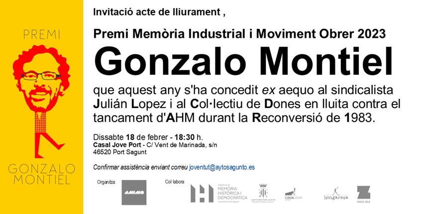 El Casal Jove de Puerto de Sagunto acogerá el próximo sábado, 18 de febrero, a las 18:30 horas la entrega de los V Premios Memoria Industrial y Obrera Gonzalo Montiel. En esta quinta edición, la Asociación Memoria Industrial y Movimiento Obrero (AMIMO) reconoce la trayectoria del histórico líder sindical de CCOO en el Camp de Morvedre y del Partido Comunista de España, Julián Antonio López Martínez, con una larga trayectoria sociopolítica.